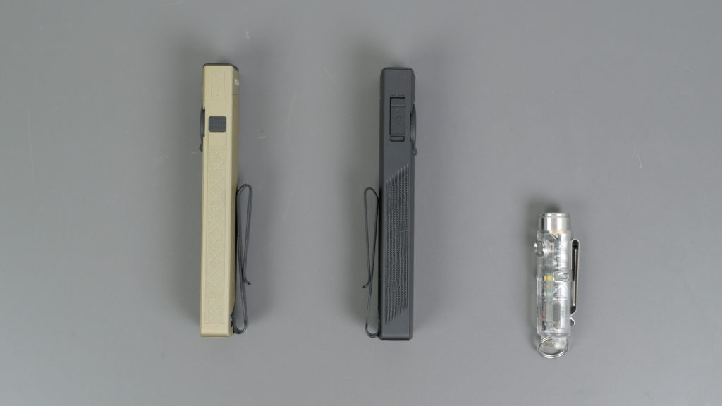 The main attraction of these torches is their flat design that makes them way more pocketable than a comparable round torch. So perfect for EDC or Everyday Carry. All three torches are 16mm or 0.63 “ thick – that’s only fractionally thicker than the tiny torch I still always have on me from my keychain sized torch roundup – the RovyVon A8.