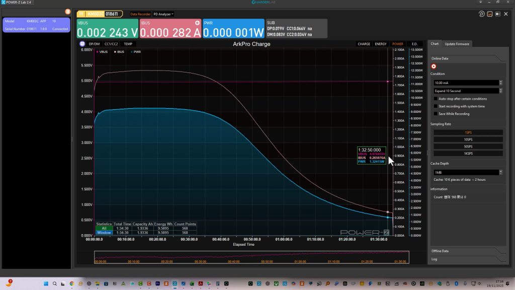 It charges at around 9W for the first 30 minutes or so and then slowly drops its charging speed from then on – so typically conservative charging speeds from Olight but still twice the speed of magnetic charging!