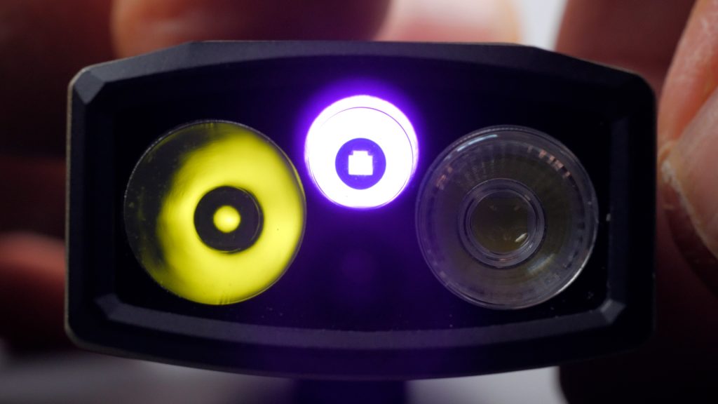 When you turn on the torch and cycle through the modes, the green battery level and white brightness level LEDs briefly light up, to see what mode you’re in.