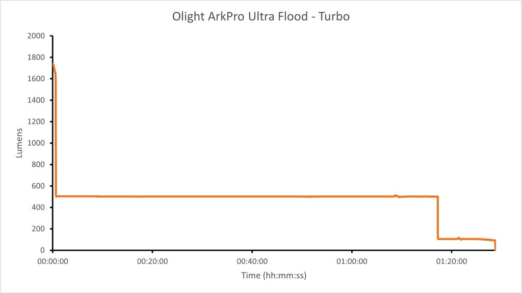 Next I measured the runtime of the Flood in Turbo mode with a fully charged battery in my DIY lumen test chamber. I measured 1738 lumens at turn on, 1658 lumens at 30 seconds, but then it dropped rapidly to just over 500 lumens in the next 30 seconds, where it ran for around 75 minutes before dropping again. So I didn’t get the claimed 3 minutes at Turbo or 140 minutes in high. Most likely due to thermal throttling. In real use with a cool breeze, runtimes will be longer.