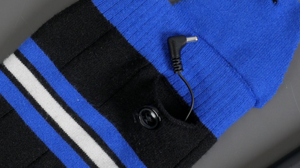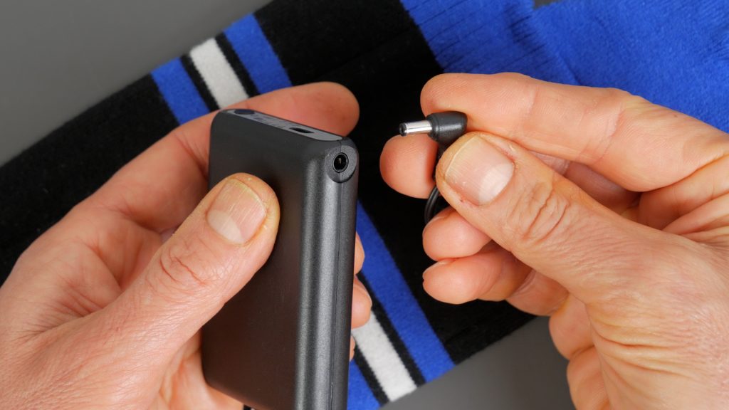 The socks have a little pocket for the battery secured with a button. It’s a little basic but it works ok and if it does eventually break off which it will, it’s easy to replace. Inside is the small DC 35135 barrel jack connector for the batteries.
