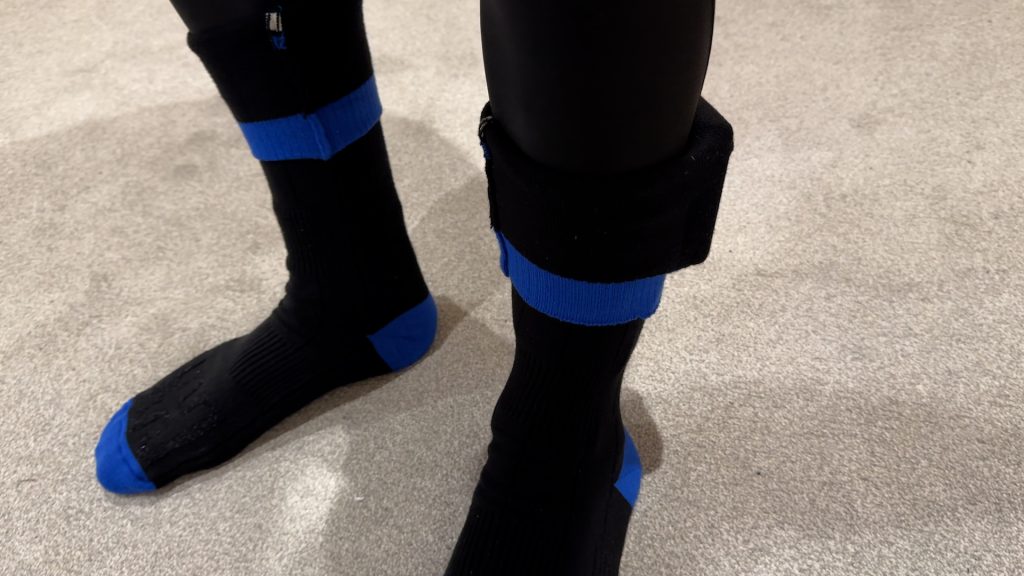 In the box you get the socks themselves, two 6000 mAh batteries, a double USB charging cable and a zipped wash bag. They’re pretty thick socks especially around the heating element, but they still fit ok in my cycling shoes.