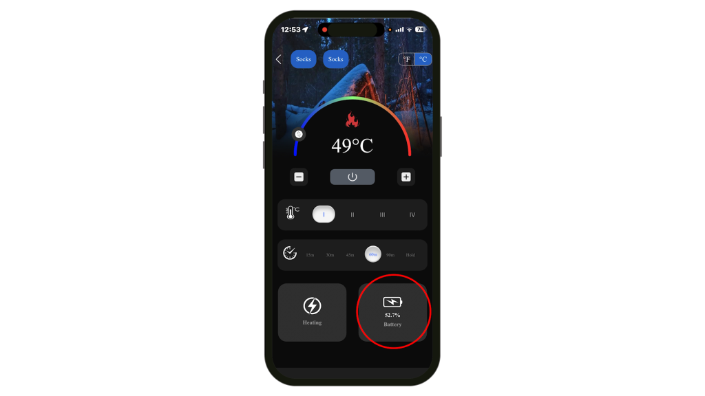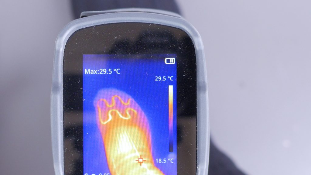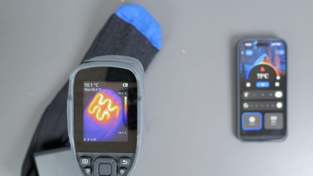 Typically I turn the socks on and set the heat level with the power button on the batteries. But the smartphone app is useful when you’re out and about and the batteries are tucked out the way. It has the same heat output levels but also gives a target temperature from 45°C to 75°C. There’s a battery level indicator as a percentage and you can also set a timer in the app too. I measured the heat output from the socks with my thermal imaging camera. I didn’t quite get the claimed temperatures –