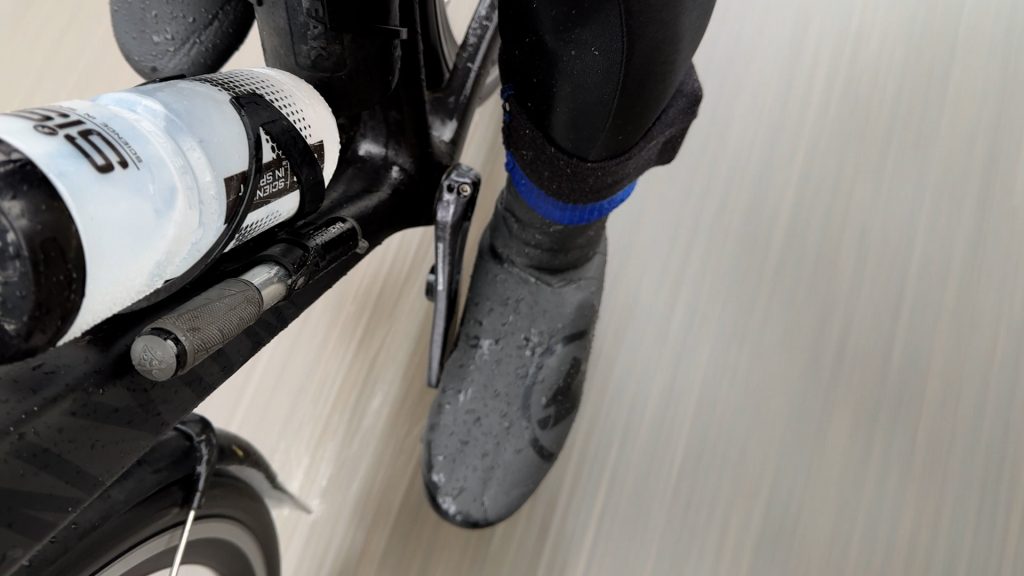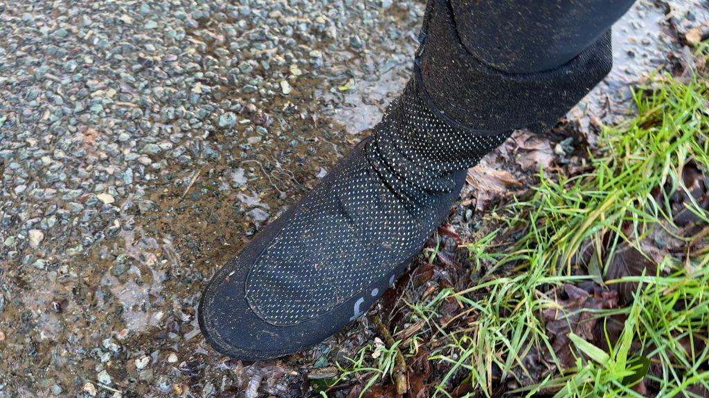I’ve used them over the last few weeks cycling in some quite horrible weather. I’ve done over 500 miles in them so far, a lot of those miles without any mudguards. And mostly it’s been below 5°C and wet – the sort of conditions where my feet eventually get cold whatever overshoes I use. Even in their lowest setting with the socks soaked through I’ve not had cold feet. And I can get away with lighter weight overshoes too.