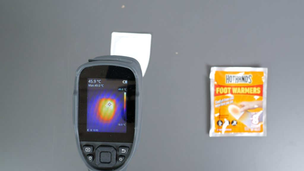 I got between 10 and 15°C lower but a still impressive 60°C in their highest mode – sometimes creeping higher than that. Of course this will depend on ambient temperatures. As a comparison I measured a disposable foot warmer.
