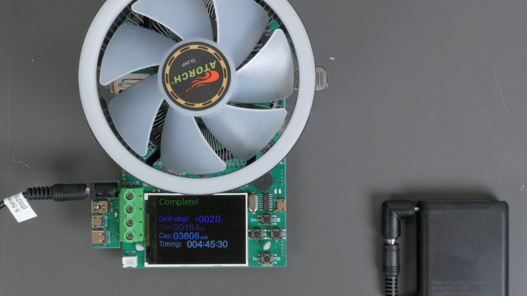 To test that properly, I discharged one battery using a controlled load set to 0.8 A — simulating close to the highest heat setting. The battery ran for 4 hours and 45 minutes before cutting off, and I measured a usable output of 18.4 Wh.