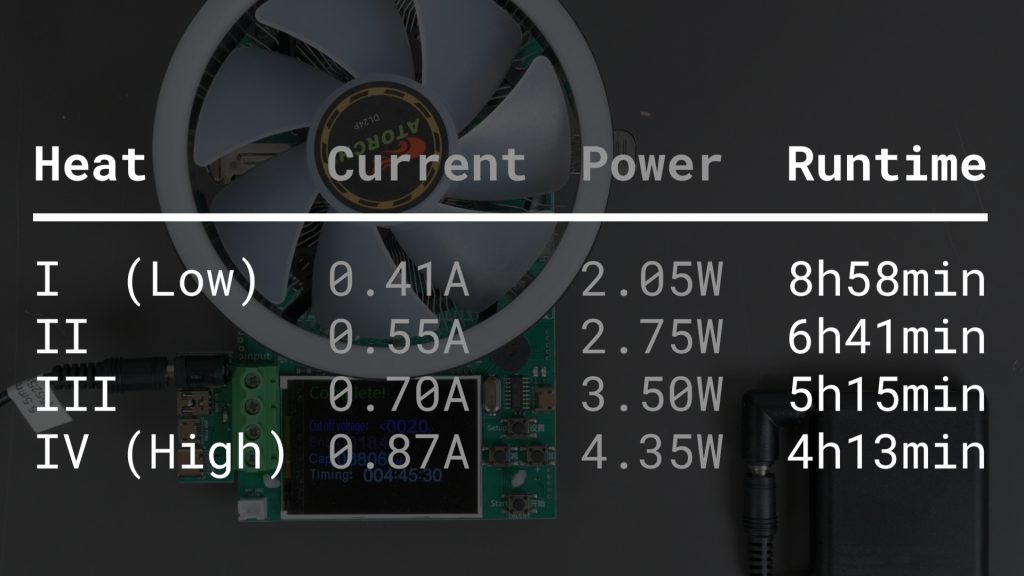 Minthouz claims 3.5 to 7 hours of battery life. To verify their claims I measured the output of each heat mode using my multimeter. I used the smartphone app to switch the output level. I measured 0.41A at level 1, 0.55A at level 2, 0.70A at level 3 and 0.87A in the highest level 4 heat mode.