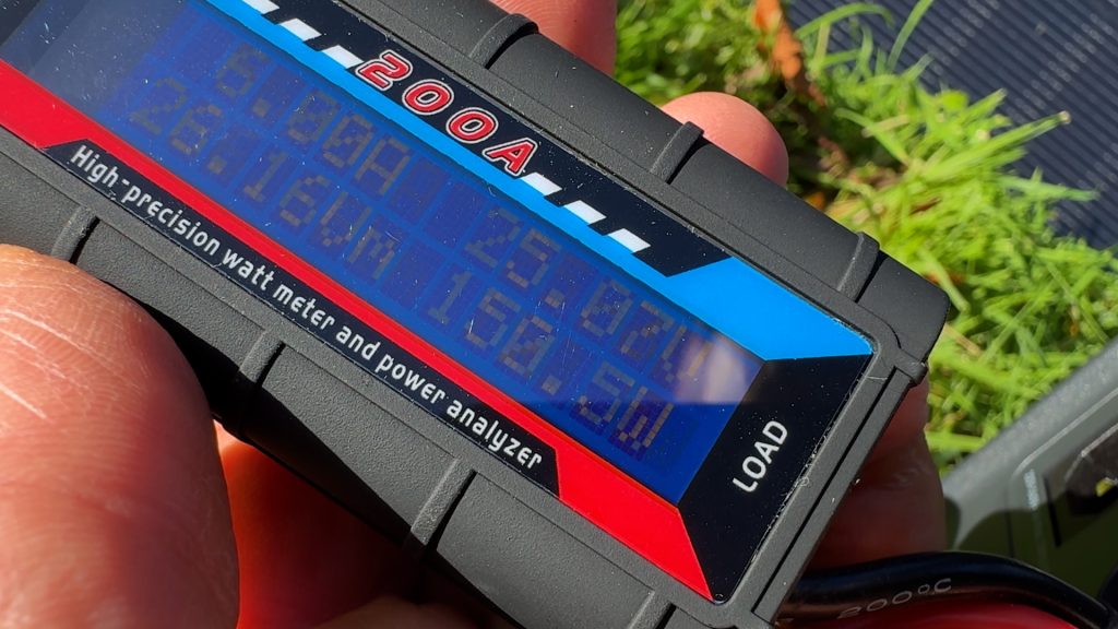 Typically the sun barely made an appearance when I first tested the panel so I only got around 20W, but I tried again another day and got 70W.