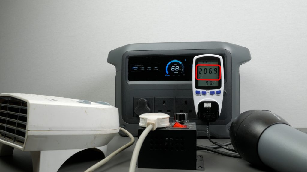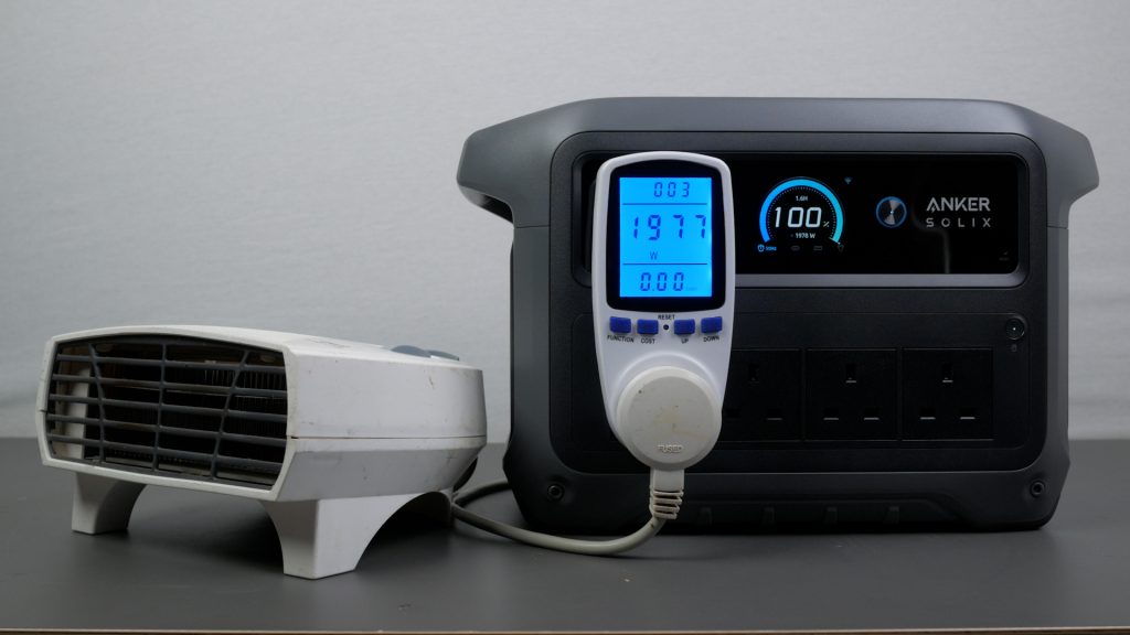 I could run most household items, including a 2000W fan heater, a 1600W hair dryer and my 12000 BTU portable air conditioning unit – in this case running in heating mode. When the compressor kicks in, the spike in output can overload some less powerful power stations.