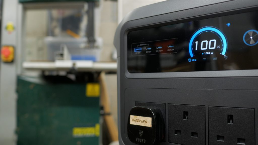To really put the inverter to the test I ran my usual machinery tests in the garage. It ran my 1800W Bosch sliding mitre saw perfectly and it could run my 14” bandsaw which has an induction motor with a large start up draw – which can trip some power stations.