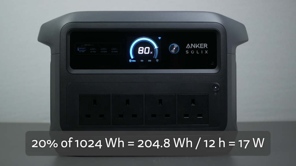 AC inverters can use a fair bit of power even when they have no load attached. By default the Anker turns off its inverter after 15 minutes when it’s not in use or using below 20W. But I turned off Smart AC Output Mode to test the parasitic drain. Starting with 100% charge I left it overnight for 12 hours with no load attached.