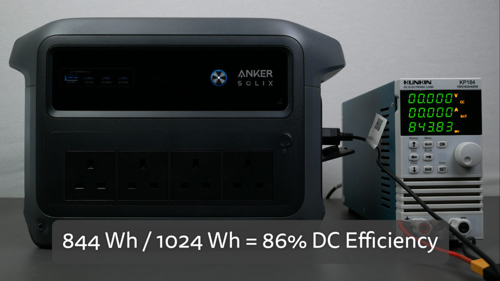 The Anker has a standard DC car outlet with up to 10A of output. I tested the efficiency of the DC subsystem with a load tester set at 8A. I measured 844Wh which is a decent 86% efficiency.