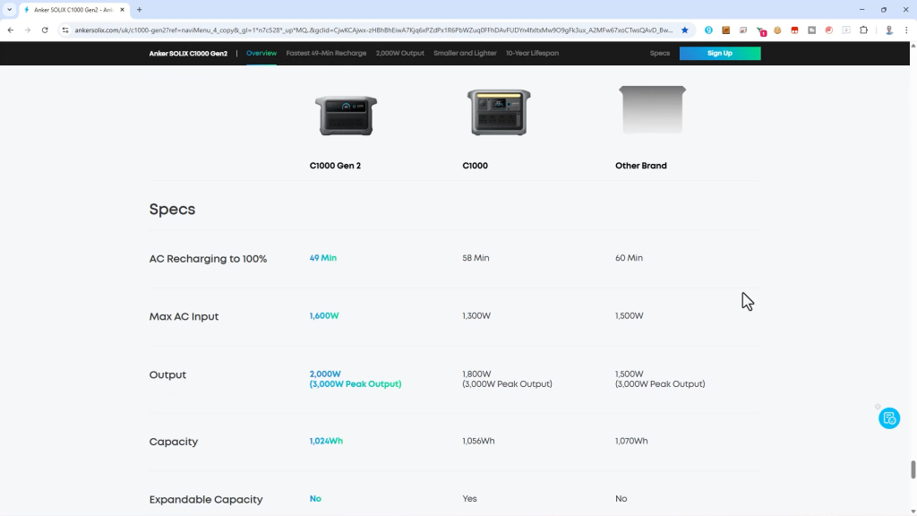 The Anker Solix C1000 Gen 2 has a well -sized 2000W AC inverter. Not quite as powerful as the DJI 1000 V2 but still plenty for most devices you’re likely to plug in and 200W more than the EcoFlow Delta 2 and Bluetti Elite 100 V2.