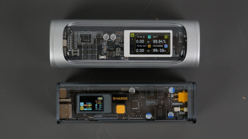 The Shargeek 300 is well built with the trademark transparent design but only around the front and back – the main body is aluminium. Through the transparent back you can see four of the six grey Ampace 21700 4 Ah cells.