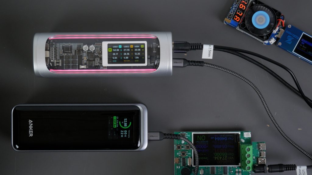 I tested all the ports at their full output to see if the Shargeek could actually achieve its claimed 300 W total output. I charged an Anker power bank at its full 140 W from the USB-C1 port, and I attached a 140 W load off the 140 W DC output and a 20 W load off the USB-A port.