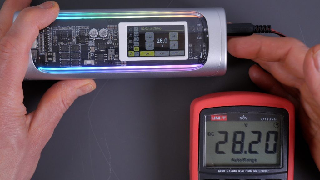 It’s aimed more at technical users, but it can be genuinely useful. You can set the output voltage of this port from 3.3 V all the way up to 28 V – at up to a decent 5 A. It would be nice if Sharge supplied at least a DC 5525 to DC 5525 cable with the power bank.